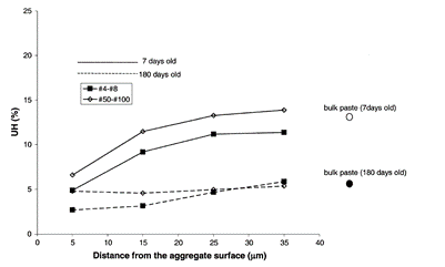 در مقابل، در بتنهایی با نسبت آب به سیمان پایینتر (مثلاً 4/0)، ساختار خمیر از ابتدا متراکمتر است و در اطراف سنگدانهها آب آزاد کمتری وجود دارد. در این حالت، ITZ نازکتر و چگالتر تشکیل میشود و bleeding در حداقل مقدار خود است. در سنین اولیه ممکن است مقدار زیادی ذرات سیمان واکنشنداده (UH) در اطراف سنگدانهها باقی بماند، اما این ذرات در طول زمان بهتدریج وارد واکنش شده و محصولات هیدراسیون جدیدی را در فضای خالی ایجاد میکنند. این فرآیند باعث میشود که با افزایش سن بتن، تخلخل ITZ کاهش یافته و چسبندگی میان خمیر و سنگدانه تقویت شود.