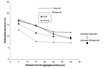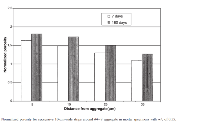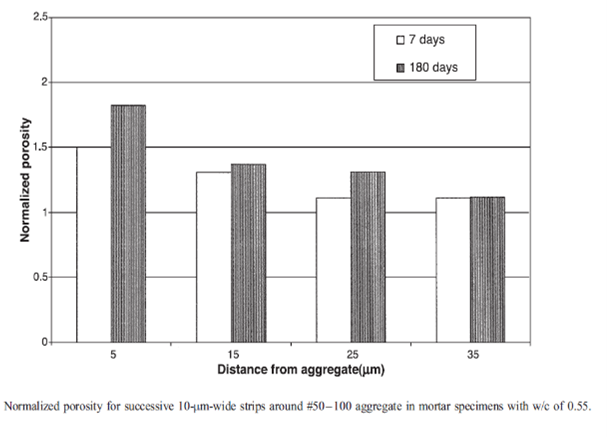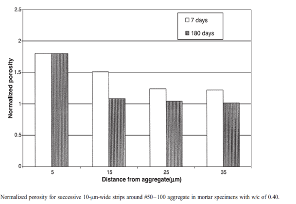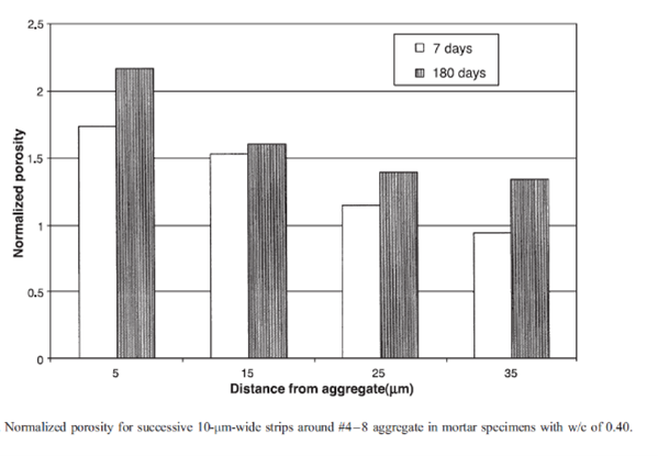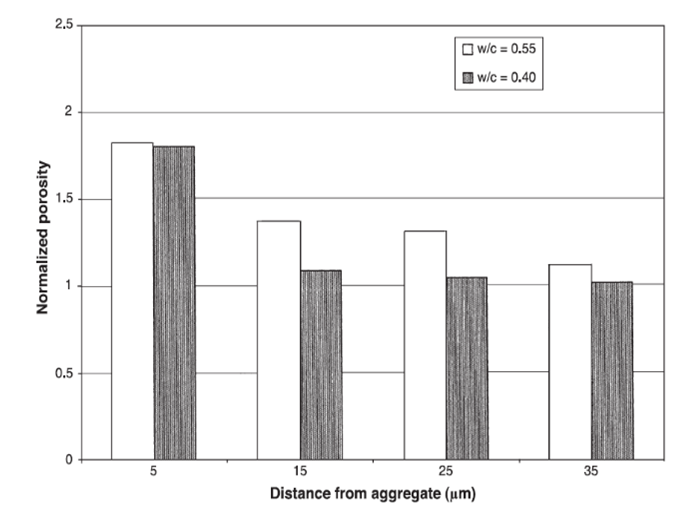در بتنهایی که نسبت آب به سیمان آنها بالاتر است (مانند 55/0)، در سنین اولیه ناحیهی انتقالی در اطراف سنگدانهها بهویژه سنگدانههای درشتتر، تخلخل بیشتری نسبت به خمیر اصلی دارد. علت این پدیده تجمع آب آزاد در سطح تماس خمیر و سنگدانه است که نسبت آب به سیمان موضعی را افزایش میدهد و تشکیل ساختار هیدراته را در این ناحیه کند میکند. در طول زمان، خمیر اصلی به دلیل چگالی بالاتر و سرعت بیشتر هیدراسیون، زودتر از ITZ متراکم میشود و در نتیجه اختلاف تخلخل بین این دو ناحیه افزایش مییابد. در چنین شرایطی، حتی با گذشت زمان، ITZ همچنان بهعنوان نقطهی ضعیف بتن باقی میماند و اختلاف مقاومت کوتاهمدت و بلندمدت محسوستر خواهد بود.